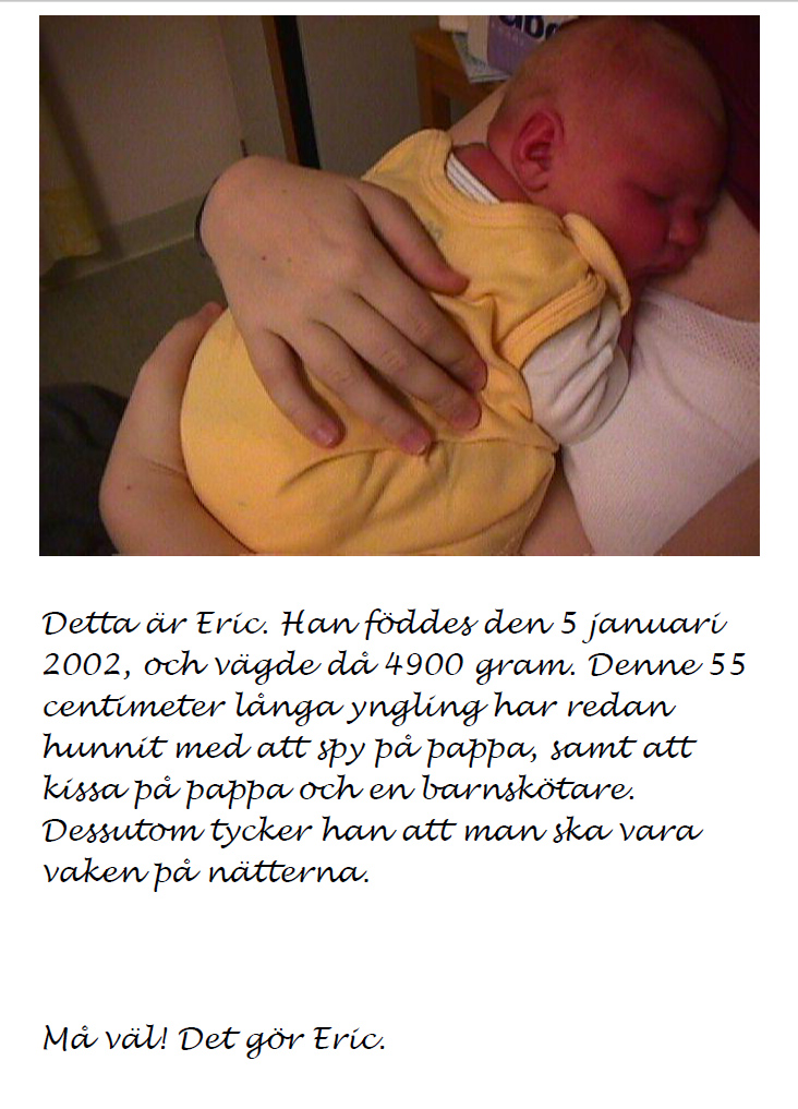 2002 förändrades tillvaron radikalt. Fram till dess hade jag och min sambo, senare fru, levt ett tämligen bekymmerslöst liv. Det var inget vi insåg då. Efter flera missfall lyckades vi äntligen få vårt första barn. Det var en fantastisk upplevelse på många plan. Förlossningen var oerhört komplicerad och jag visste inte hur jag skulle handskas med alla känslor. Efter mycket lång tid var allt klart, och jag storgrät av glädje, oro och utmattning. Man kan ju ifrågasätta om det verkligen borde vara jag och inte min sambo som skulle gråta av de orsakerna, men så var det. Inte förrän då började jag fundera på hur man ska vara som pappa, och jag kan inte påstå att mina slutsatser i frågan var särskilt skarpsinniga. Lyckligtvis hade min sambo en betydligt mognare inställning till frågan, och det räddade mig också. Livet förändrades helt och hållet, inte bara det till bättre. Nu var det till exempel färdigsovet på morgonen. Och på natten. Och resten av dygnets timmar. Så småningom insåg vi att vår första son förmodligen hade magknip, och jag var ute många nätter med honom och körde bil. Det tycktes lugna honom. Tyvärr vaknade han ofta när jag kom hem med honom för att lägga honom i sängen. Det tog flera år innan vi insåg att vårt barn var mjölkallergiker. Han kunde inte, och kan fortfarande inte, ens dricka laktosfria drycker. Så här i efterhand tycker jag att läkarna borde ha kommit på, och tipsat om, detta. Istället var det sambon som drog slutsatsen.