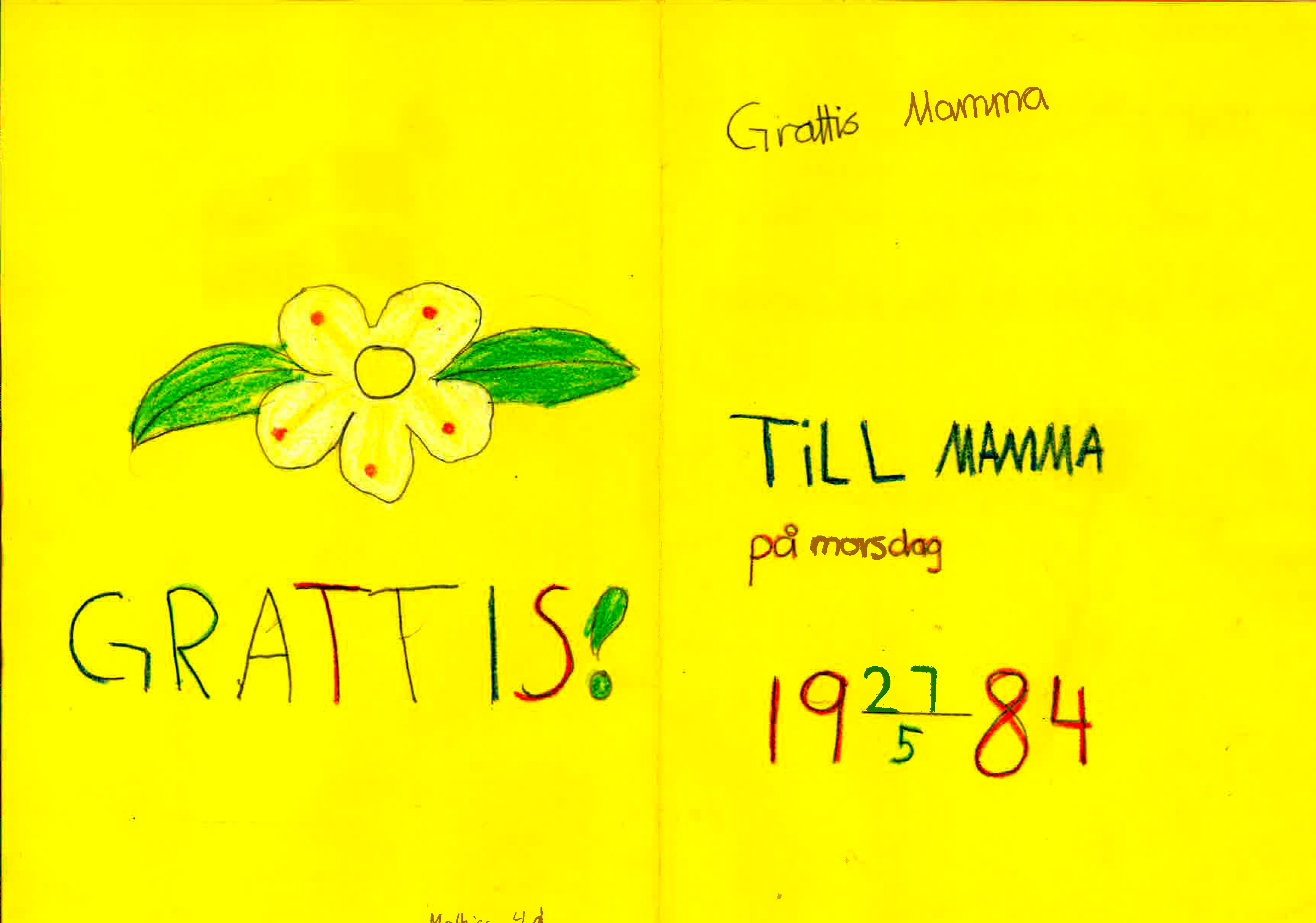 “Jag minns inte att du alltid skulle ha något att göra när du var liten. Men du läste så mycket. Du låg i din säng både dag och kväll och läste för fullt när du inte var ute och spelade landhockey eller fotboll. Du och din äldste son är lika både till sättet och till utseendet men du har aldrig varit så arg som han är ibland. Du blev lite vuxen ganska fort för att pappa var så mycket borta på veckorna. Du gick omkring och kände på dörrarna överallt i huset på kvällarna så att det var låst överallt innan vi skulle lägga oss och du tog mycket ansvar med mycket. Du bäddade din säng redan när du var fyra år och du lärde dig att koka kaffe till mig så att jag fick nykokat kaffe när du var omkring 7 år. Nu kan du ju brygga kaffe kanske men du kunde faktiskt koka riktigt gammaldags kaffe när du var 7 år. Du stod på en stol för att räcka upp ordentligt. Dessutom kunde du säga ‘Jag älskar dig’ på massor av språk. Varje kväll när jag pussade god natt så sa jag ‘Jag älskar dig’. Då svarade du med ‘Je t’ame’ och då svarade jag med ‘Ich liebe dich’ och då sa du ‘I love you’ och så höll vi på ihop. Ibland var det du som sa ‘Ich liebe dich’ och jag ‘I love you’. Men du kunde säga allt på olika språk. Vi gjorde det nästan till en sport.”