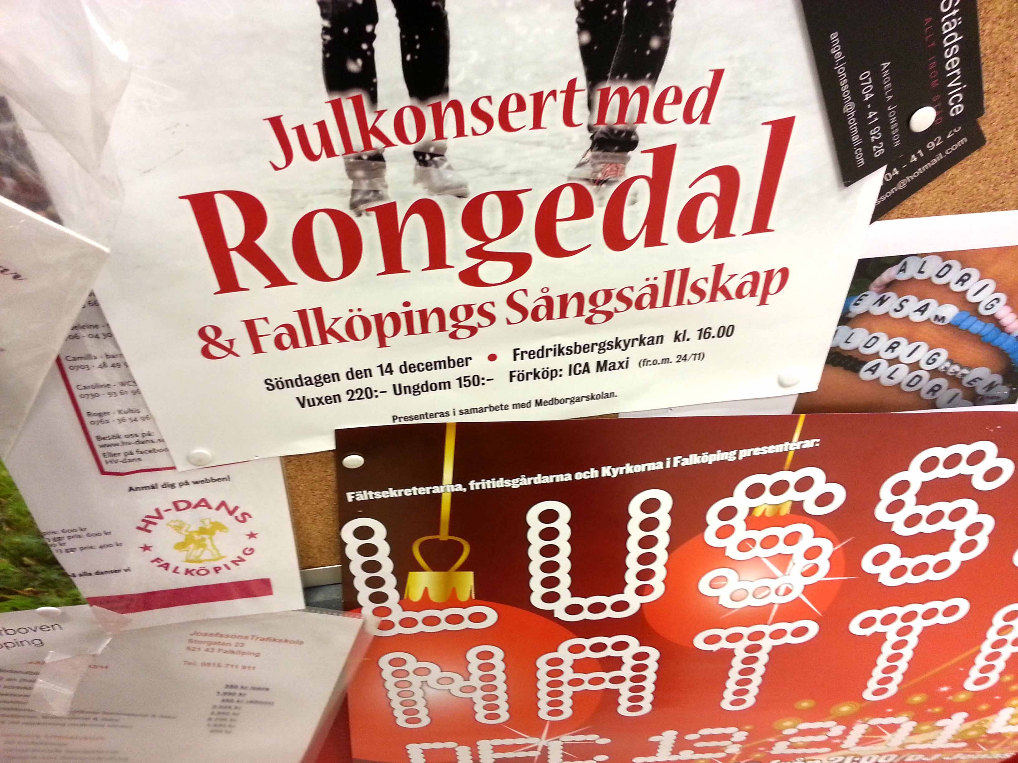 Som avslutning på året fick jag en fråga av mycket goda vänner, bland andra Mikael O och Ann-Britt W, om jag kunde komma till deras framträdande och fota kören samt de kända artisterna Rongedal. Proffsen Rongedal tillsammans med Falköpings Sångsällskap? Mitt svar var självklart innan frågan ställdes. Jag fick för mig att jag BÅDE skulle fota OCH filma. Skulle det vara möjligt? Jag tog med två kameror för att testa, och tänkte att om jag mot förmodan klarar att både fota och filma samtidigt kanske kan jag klippa ihop filmerna sedan? Trots allt skulle det bli två föreställningar eftersom så många sökt biljett. Dock tänkte jag inte på att jag hade behövt filma med båda kamerorna samtidigt för att kunna klippa ihop allt. Nu filmade jag ist