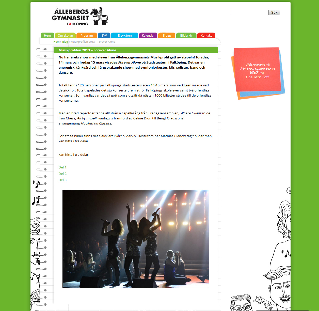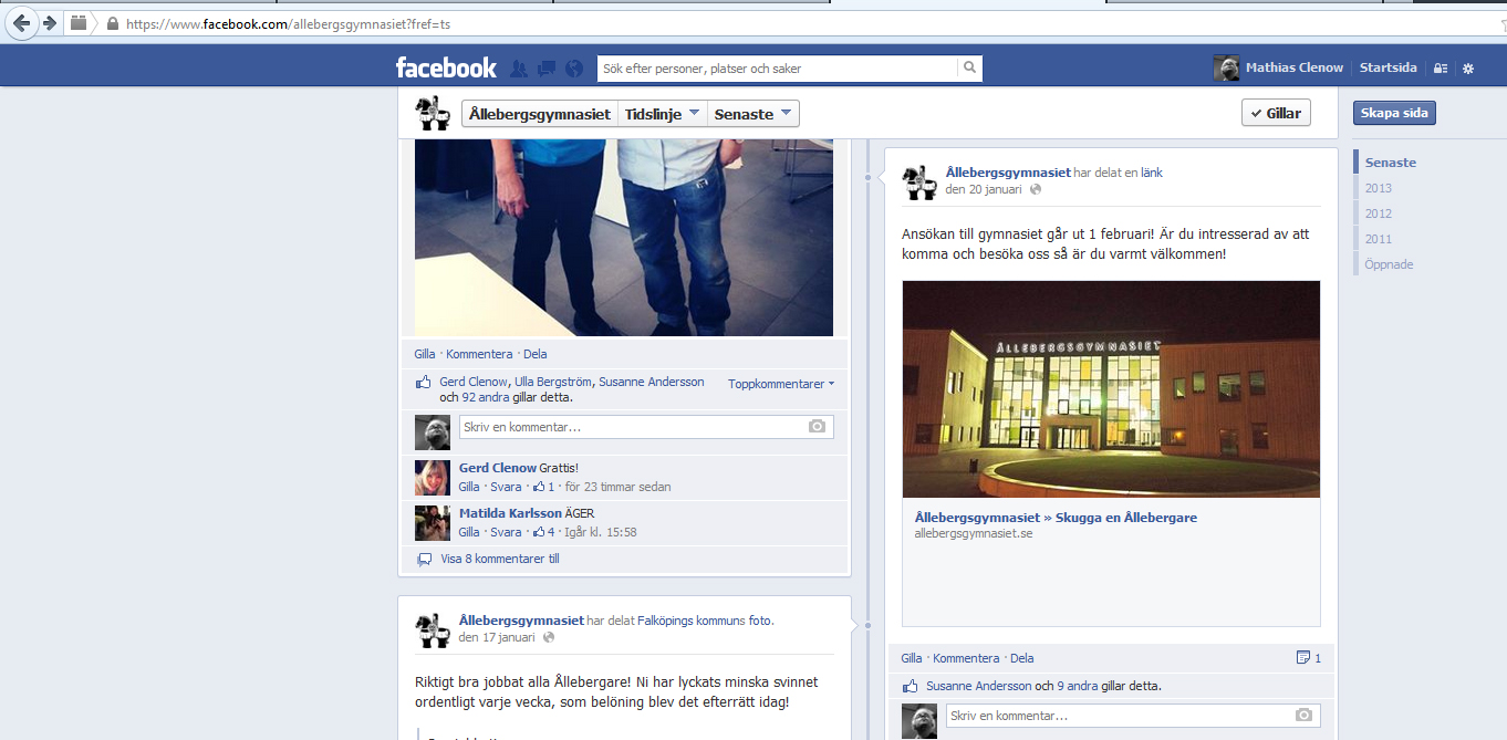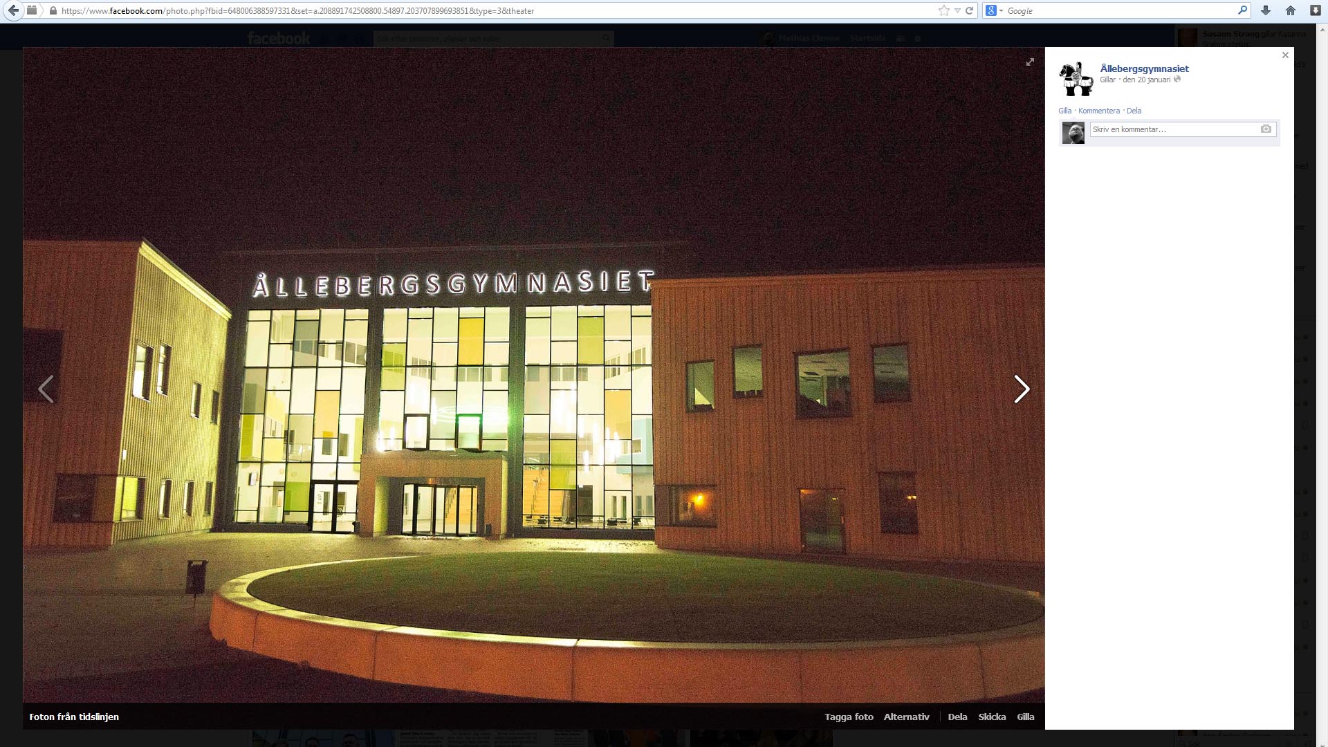 När jag skulle cykla till en vän för några månader sedan, fick jag för mig att jag skulle ta med mig en kamera. Jag kunde själv inte förstå varför kameran skulle vara med, men på vägen tillbaka från vännen tog jag några bilder på Ållebergsgymnasiet i Falköping. Jag mailade bilderna till den som har hand om hemsidan och hon mailade vidare till rektorn. En av bilderna hamnade på skolans Facebooksida, vilket jag blev förvånad och lite stolt över.